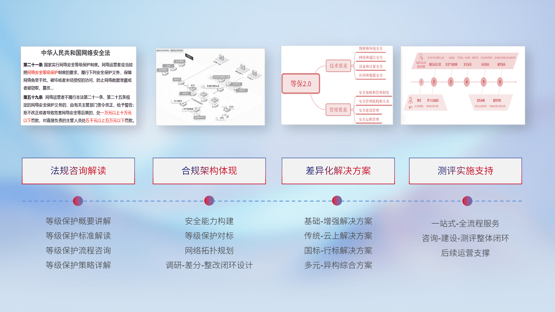 通过专业的法律咨询解读、、、合规架构体现、、、、差异化解决方案、、、测试实施支持等服务,,,为客户量身打造等保合规体系。。。